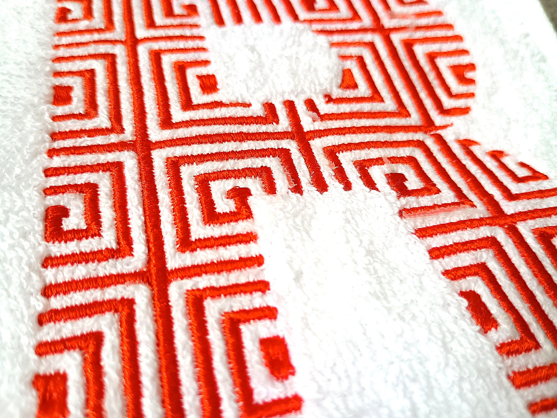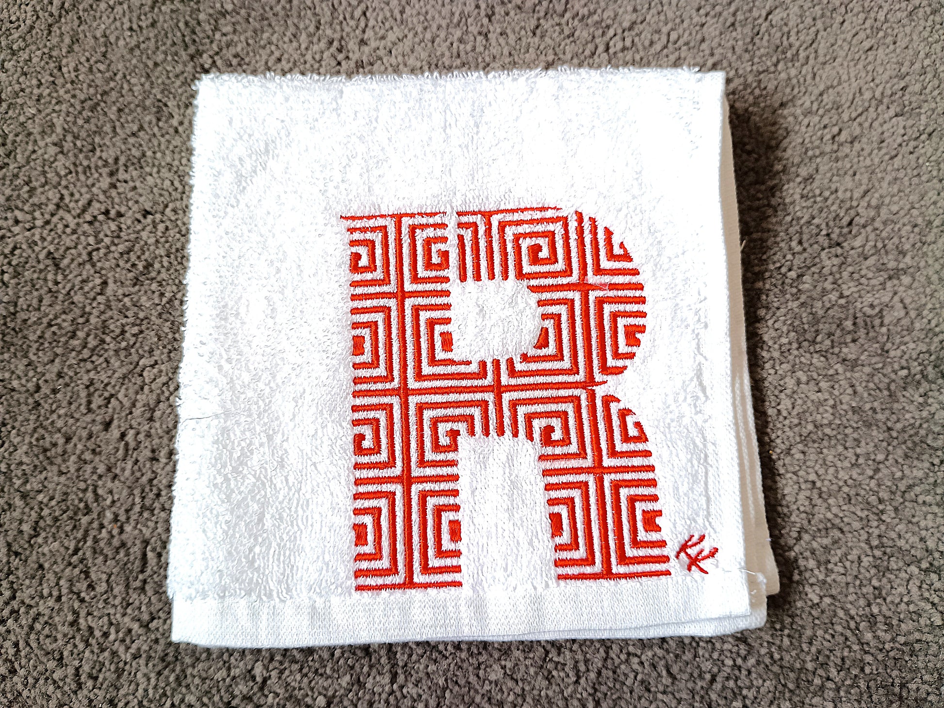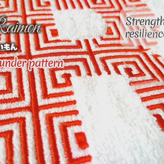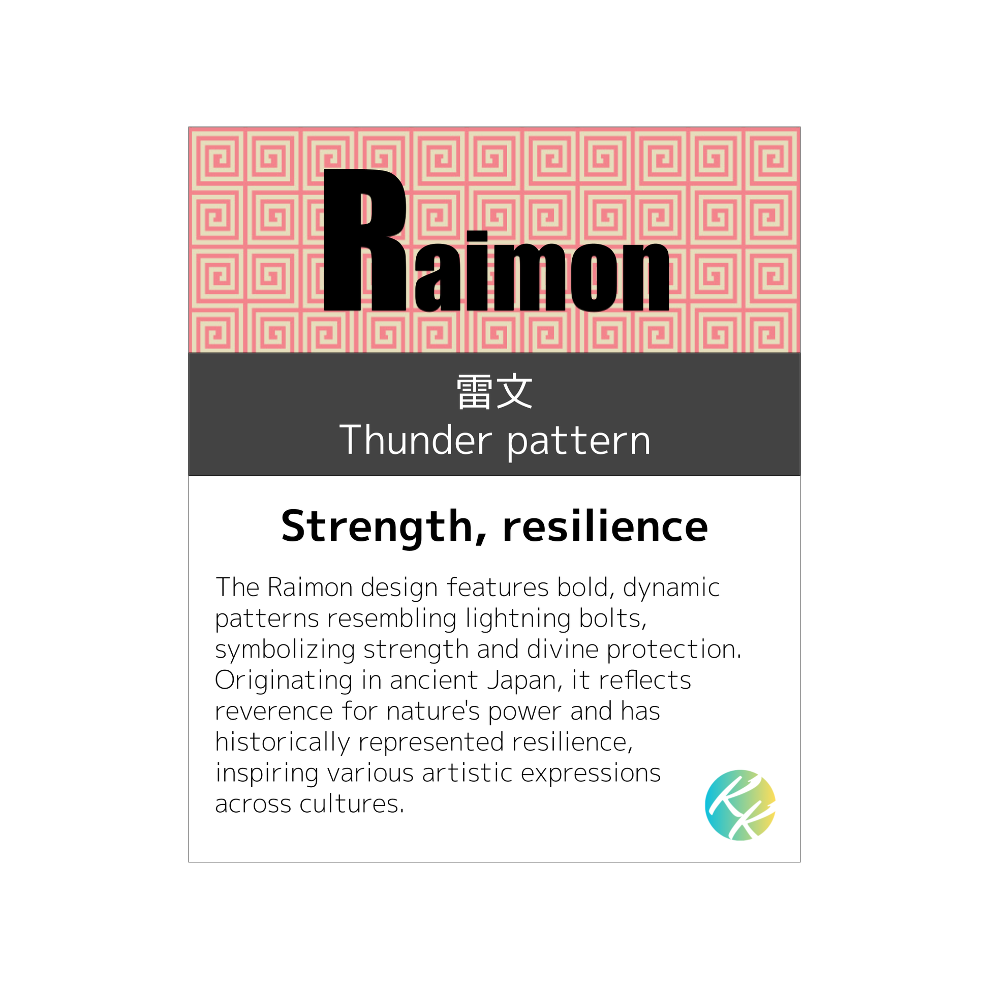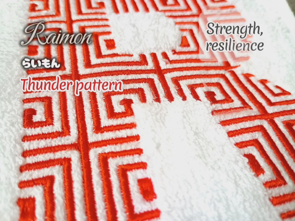 A monogram letter R filled with the wagara (Japanese pattern) Raimon. Raimon (Thunder pattern) traditionally symbolises strength and resilience. Your name (or a special loved one’s) beautifully embroidered, with personalisation included at no extra cost.