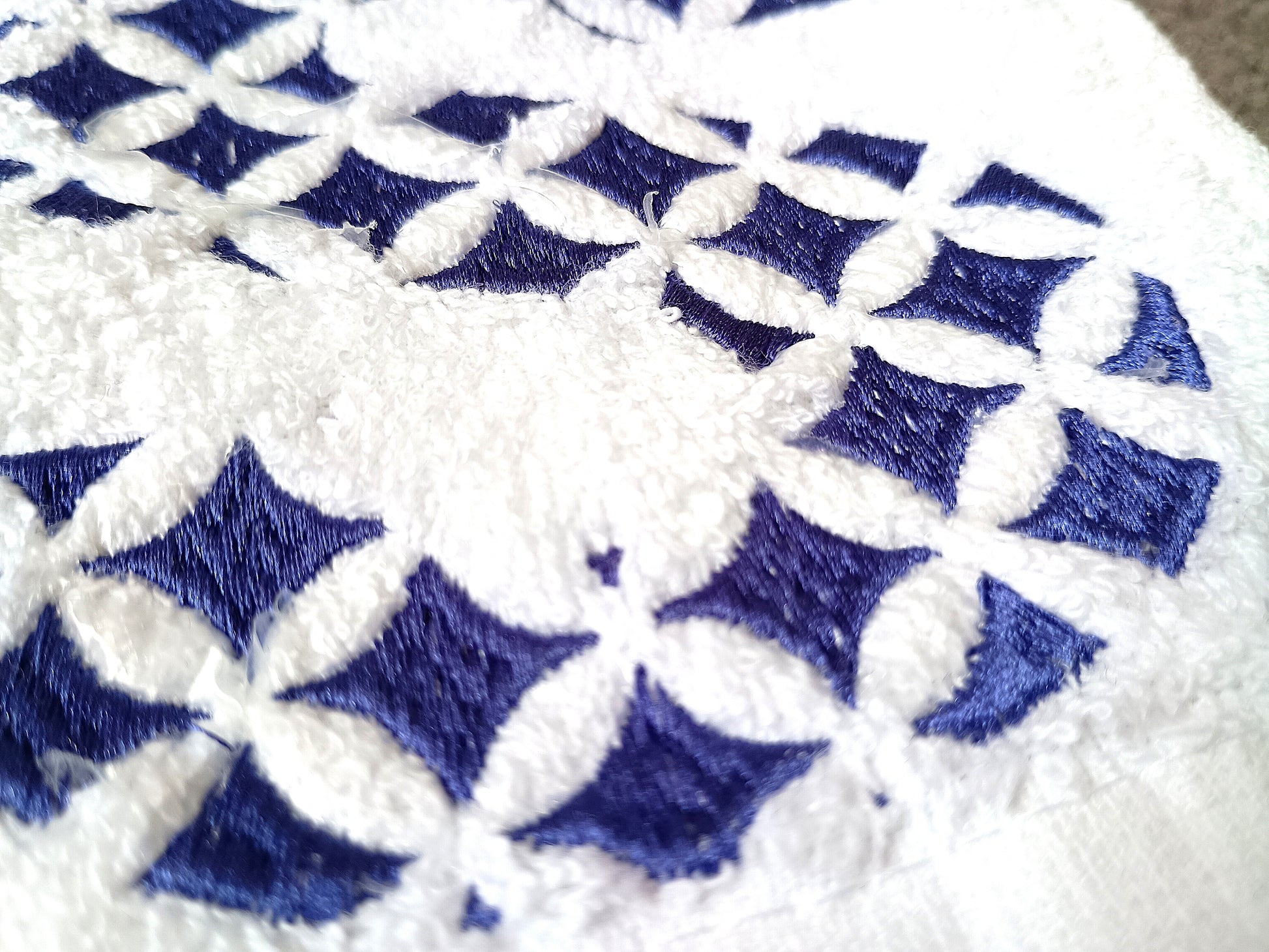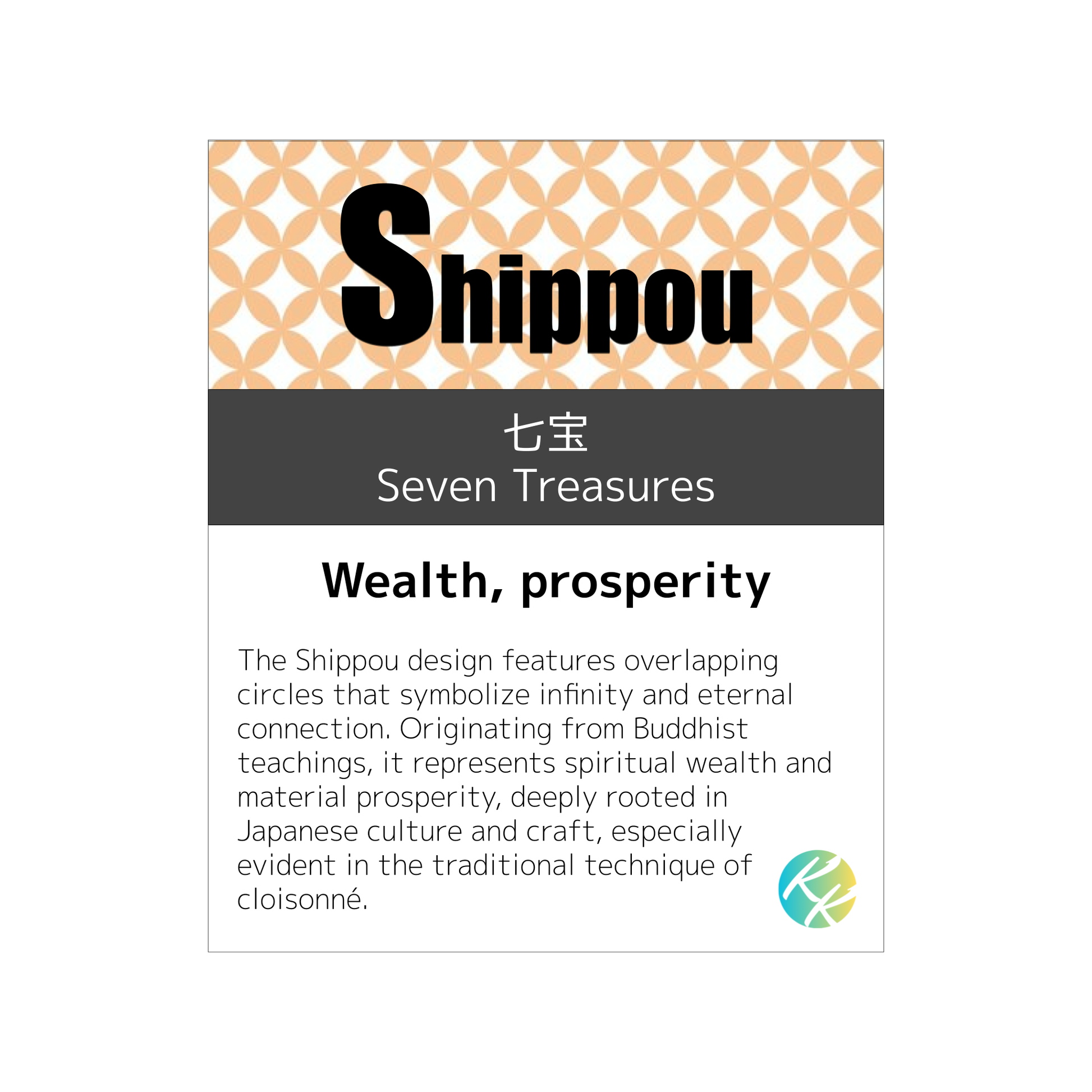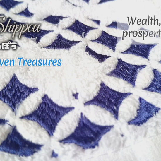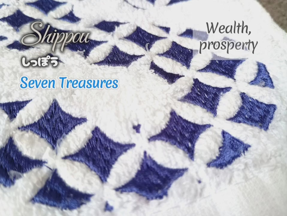 A monogram letter S filled with the wagara (Japanese pattern) Shippou. Shippou (Seven treasures) traditionally symbolises infinity, wealth and prosperity. Your name (or a special loved one’s) beautifully embroidered, with personalisation included at no extra cost.